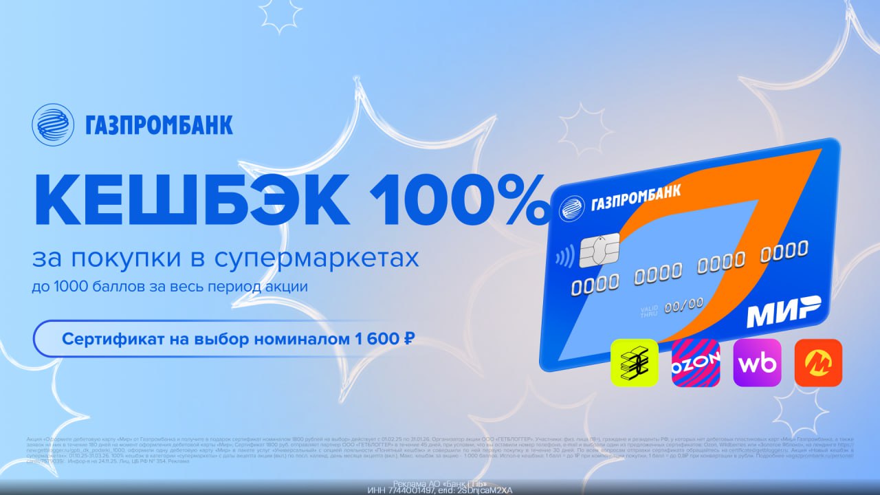 ▶️ Получить сертификат на 1600 руб. за бесплатную карту Газпромбанка с кэшбэком 100% в супермаркетах