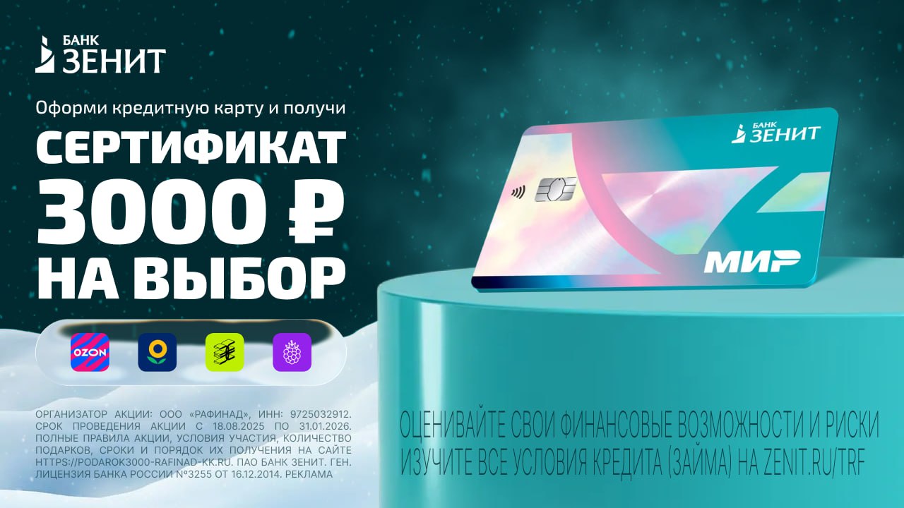 Если заказать бесплатную кредитную карту "120+120 ДНЕЙ НА ВСЁ" от Банка ЗЕНИТ по этой ссылке и в первые 30 дней потратить по ней от 500 руб. (не из списка исключений), то в подарок будет положен сертификат на 3000 руб. OZON/WB/Золотое Яблоко/Ленту. Сертификат от партнёра (ООО "Рафинад") придёт в СМС/email в течение 60 дней.