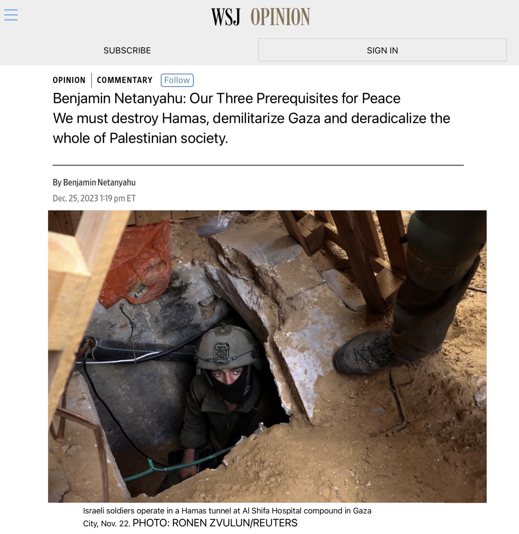 Премьер-министр Израиля Биньямин Нетаньяху написал статью для The Wall Street Journal, в которой изложил три предпосылки для мира в регионе: уничтожение ХАМАС, демилитаризация сектора Газа и начало процесса дерадикализации палестинского общества.