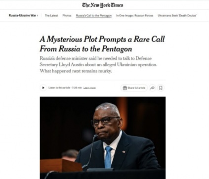 «Белоусов звонил, чтобы передать предупреждение, согласно двум официальным лицам США и еще одному официальному лицу, проинформированному о звонке: русские обнаружили украинскую тайную операцию, готовящуюся против России, которая, как они считали, была одобрена американцами. Знал ли Пентагон о заговоре, спросил г-н Белоусов г-на Остина, и о его потенциале усилить напряженность между Москвой и Вашингтоном?» - пишет издание.