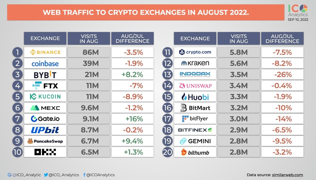 โโWeb traffic to crypto exchanges in August 2022. According to the data from SimilarWeb in August a cumulative web traffic to cryptocurrency exchanges has decreased by 9%. It is -50% YTD.