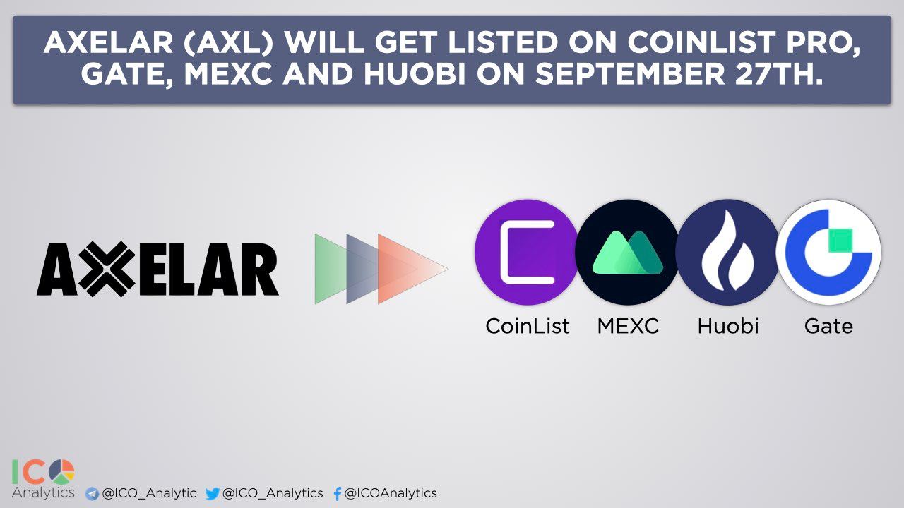 ββAxelar (AXL) will become available for trading on CoinList Pro, Gate, MEXC and Huobi on September 27th. AXL will enter the market with 30M tokens (3% of total supply) as initial circulating supply. ICO price on CoinList: $1/AXL ($1B fully diluted valuation). Axelar is building a decentralized network and tools that connect users, assets, and dApp across multiple blockchain ecosystems.