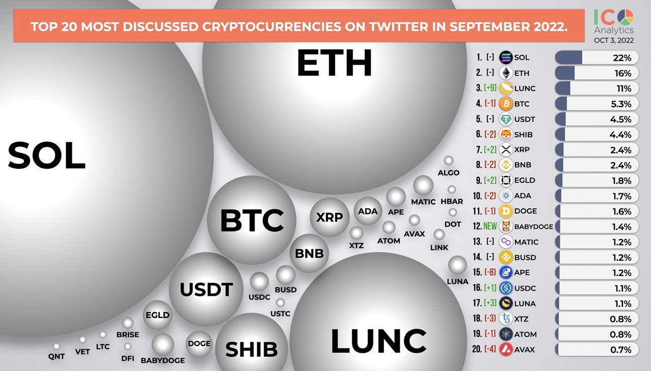 ββTop 20 most discussed cryptocurrencies on Twitter in September 2022. In the chart below you can find a share of mentions of each coin among top 150 coins by market cap.