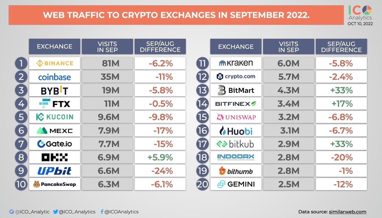 ββWeb traffic to crypto exchanges in September 2022. According to the data from SimilarWeb in September a cumulative web traffic to cryptocurrency exchanges has decreased by 5%.