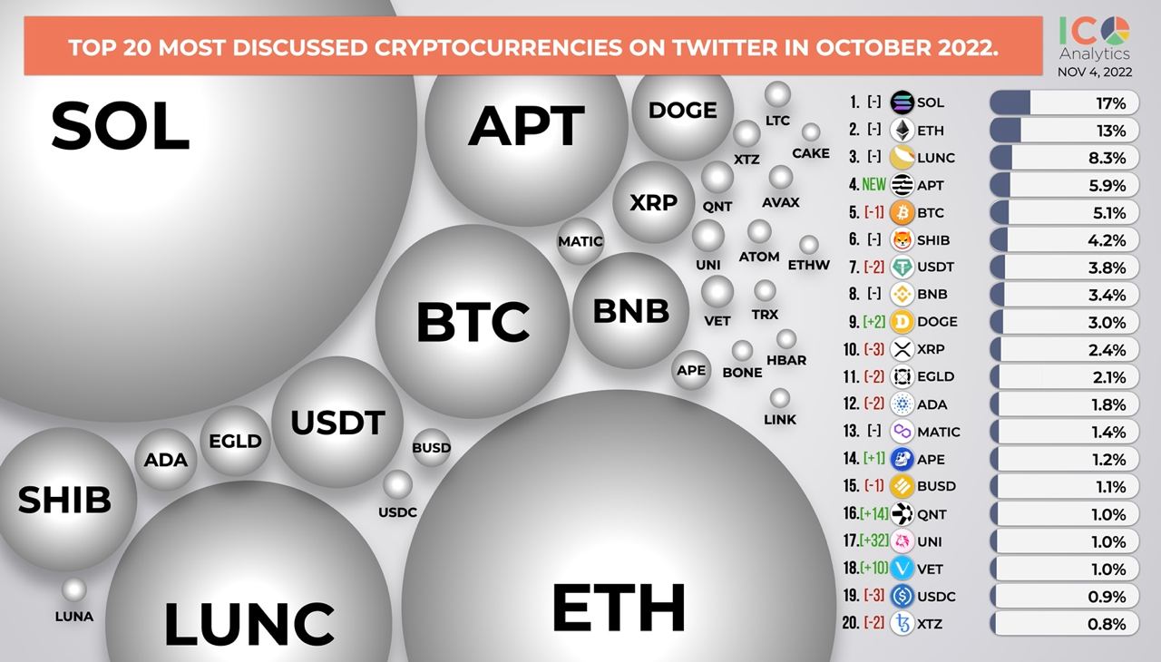 ββTop 20 most discussed cryptocurrencies on Twitter in October 2022. In the chart below you can find a share of mentions of each coin among top 150 coins by market cap.