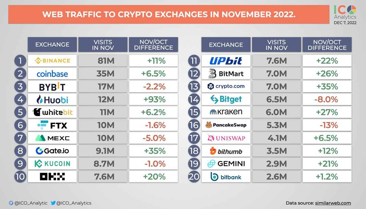 ββWeb traffic to crypto exchanges in November 2022. According to the data from SimilarWeb in November a cumulative web traffic to cryptocurrency exchanges has increased by 8%.