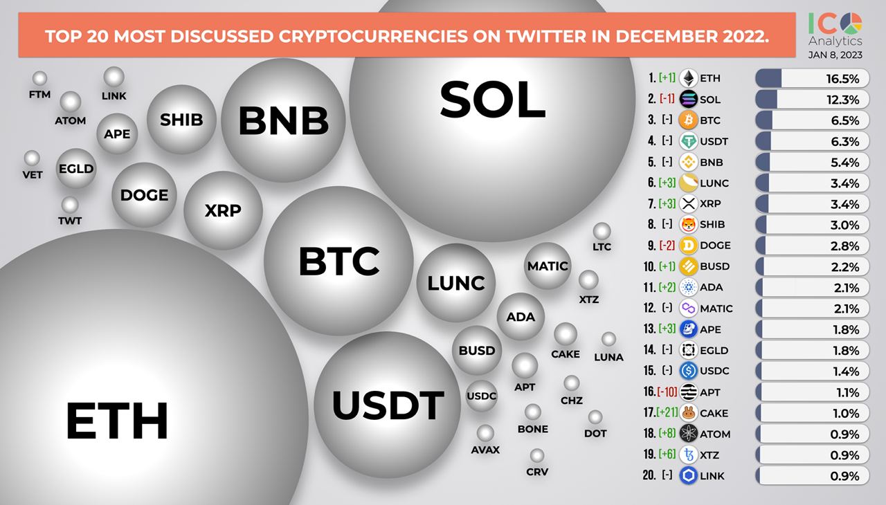 ββTop 20 most discussed cryptocurrencies on Twitter in December 2022. In the chart below you can find a share of mentions of each coin among top 150 coins by market cap.