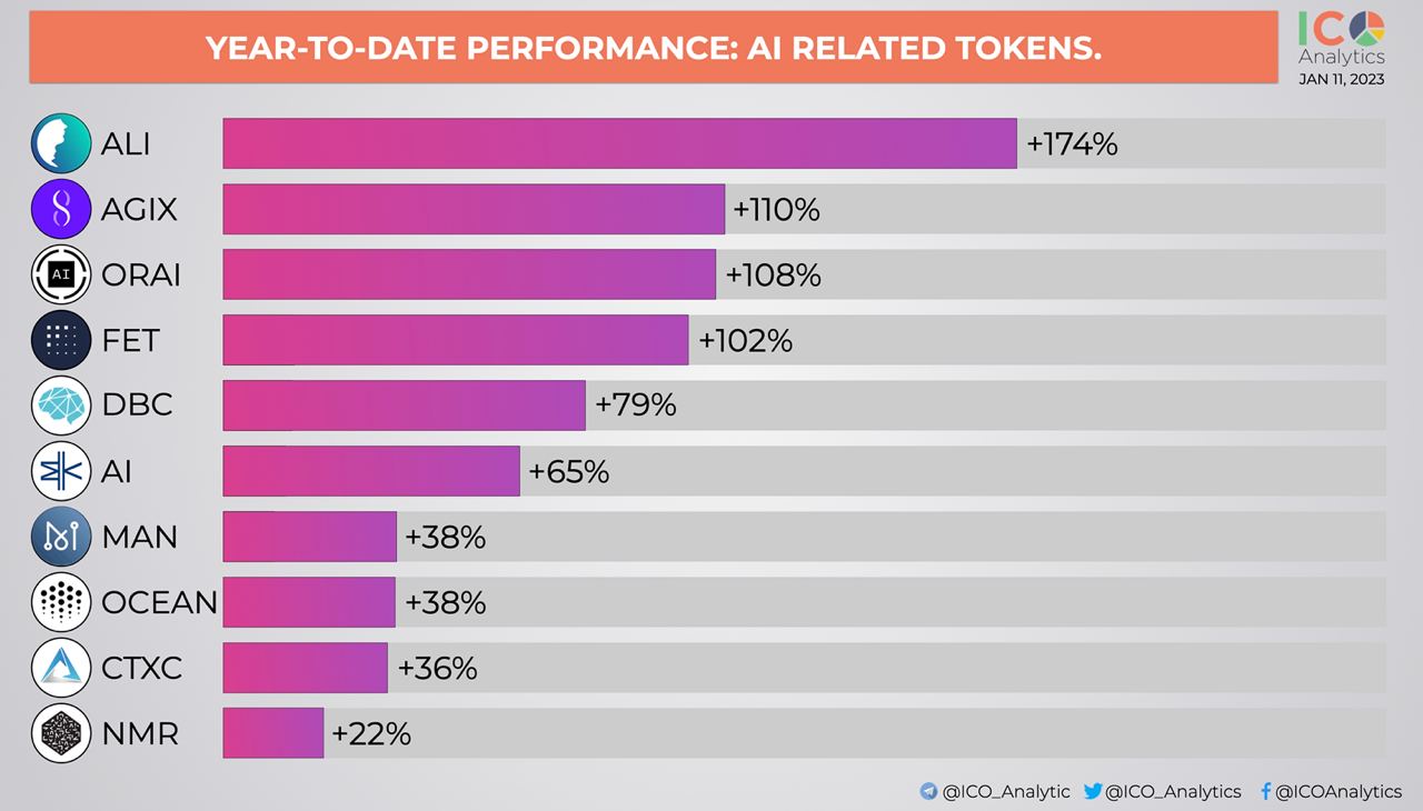 ββPerformance of some of the AI related tokens year-to-date. AI is a popular topic in crypto in 2023 and can follow the last yearβs metaverse trend.