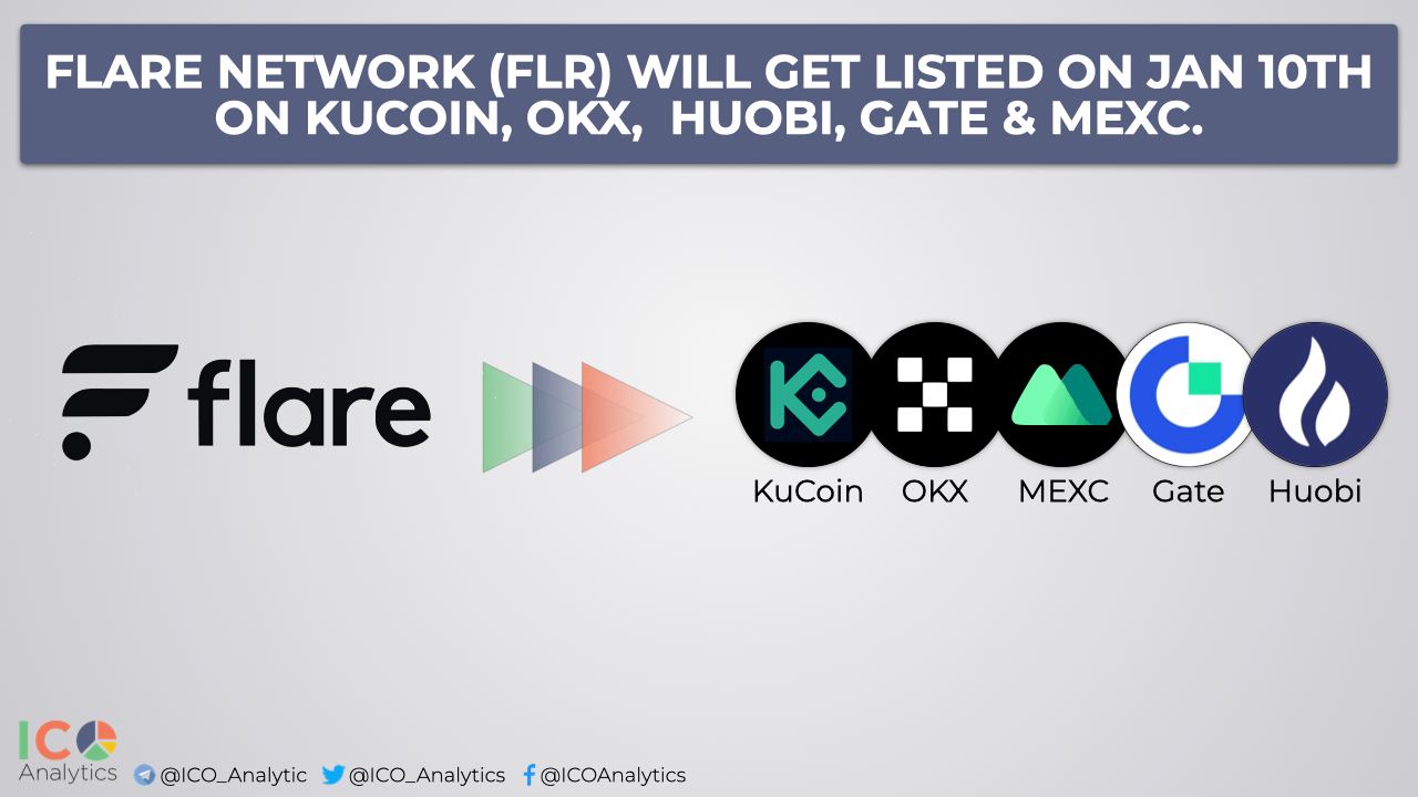 ββFlare Network (FLR) will have a primary listing on January 10th. KuCoin, OKX, Huobi, Gate & MEXC will list the token. FLR token distribution will begin on January 9th at 23:59 UTC. FLR will enter the market with 12B out of 100B genesis token supply.