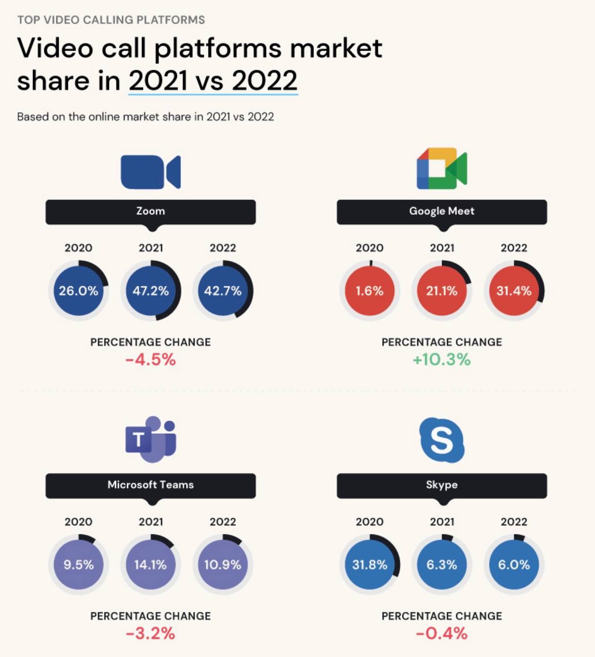 Для вас нашел статистику, в которой видны доли рынка и динамика за последние 3 года. По ней видно, что Teams сильно уступают Зуму и Гугл митс. В 2022 году MS Teams занимали всего 10.9% всего рынка видео звонков, достигнув пика в 300 миллионов пользователей. Только при этом они потеряли 3.2 п.п. по сравнению с 2021 годом.