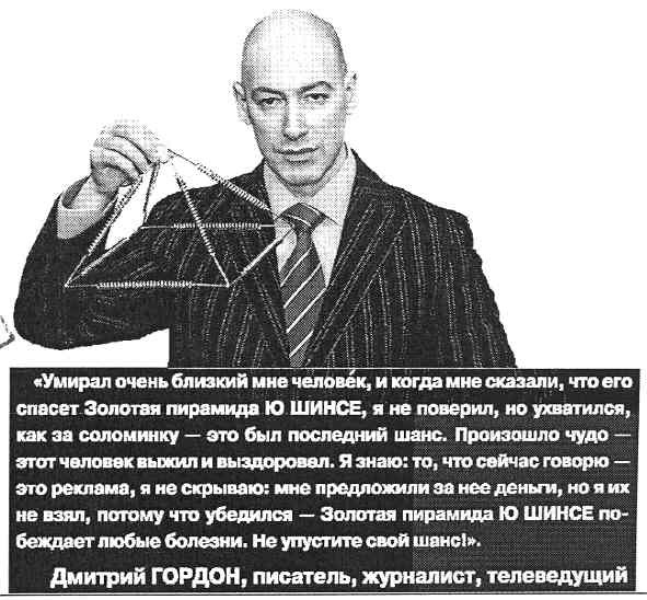 Если кто не в курсе. Помимо того, что Дмитрий Гордон сделал своё состояние в 90-е на организации концертов целителей, гадалок, экстрасенсов, (в том числе Чумака и Кашпировского). Он отличился рекламой пирамидок Ю-Шинсе, которые якобы спасали от онкологических заболеваний. Бог знает, сколько жителей Украины воспользовались его советом, и отложили визит к врачу.