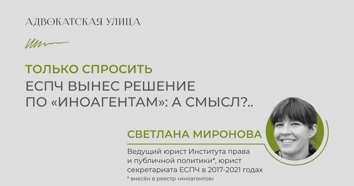 Ведущий юрист Института Светлана Миронова, 4 года проработавшая в секретариате ЕСПЧ, кратко рассказала «Адвокатской улице» о сегодняшнем постановлении ЕСПЧ по российским иноагентам, ответила на популярные вопросы и поделилась своим прогнозом о том, что будет дальше.