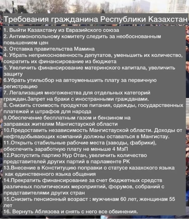 Интернет отключен (еле работает через ВПН), телефонная связь вырублена, банки и магазины не работают, в двух регионах введен комендантский час. Чего хотят - неясно, цены на газ снизили, правительство отcтавили, социальные плюшки пообещали. По телеге и другим соцсетям ходило (пока работали) много всяких “требований гражданина Казахстана”, нам больше понравились вот эти: объявить регион с нефтью независимым государством, остальным на оставшиеся деньги снизить цены. :-) @infernal_money