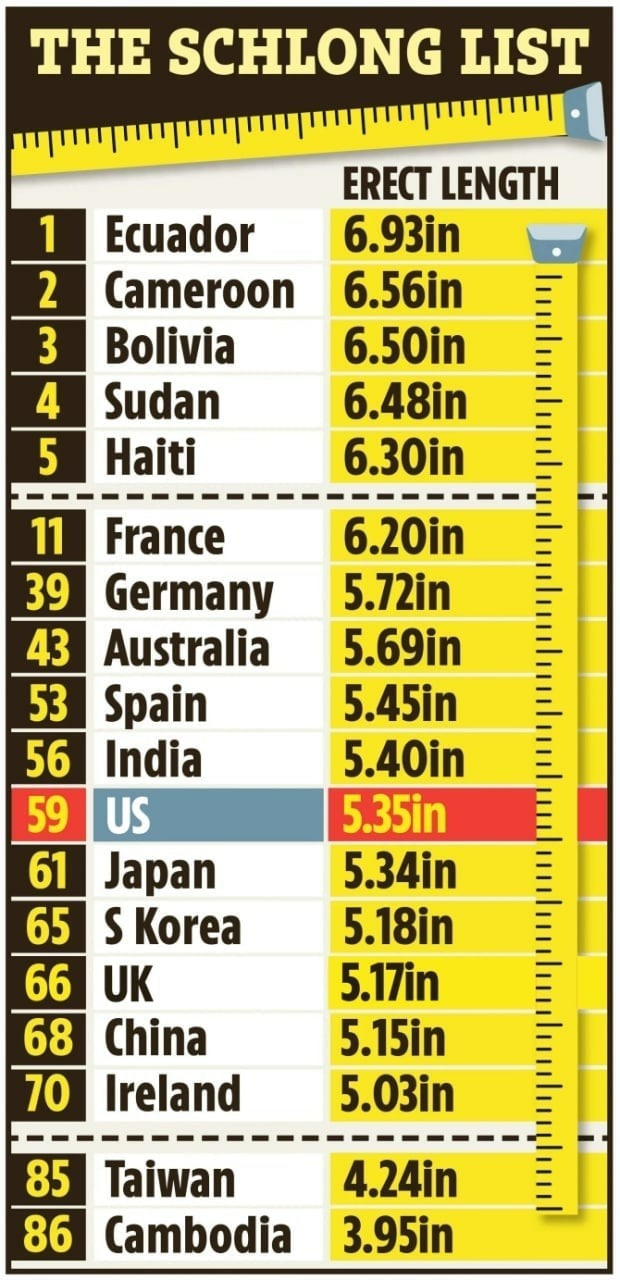 Итак, возглавляет список Эквадор, где средняя длина пениса в состоянии эрекции около 17 см (1 дюйм - это 2,54 см) Франция занимает 11-е место (почти 16 см), Германия — 39-е (15 см), США на почетном 59-м месте (14 см). Замыкает рейтинг Камбоджа, где средняя длина пениса равна 10 см.