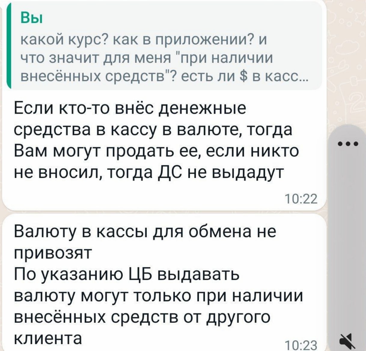 Но, согласитесь, это прогресс: раньше был некий официальный курс, по которому нельзя было купить наличные доллары, но теперь на них можно хотя бы посмотреть:) @infernal_money