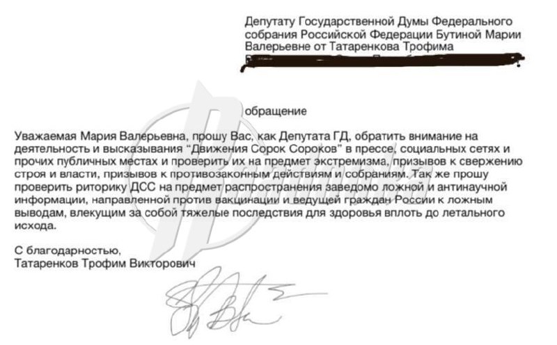 Как и предполагала Readovka, аргументация в приложенном к депутатскому запросу Марии Бутиной (приложение народная избранница постыдилась публиковать) заявлении блогера Трофима Татаренкова оказалась просто смехотворной: «Прошу обратить внимание на деятельность и высказывания Движения «Сорок сороков» в прессе, социальных сетях и прочих публичных местах и проверить их на предмет экстремизма, призывов к свержению строя и власти, призывов к противозаконным действиям и собраниям».