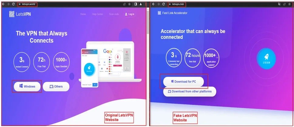 Американская компания Cyble обнаружила ряд поддельных сайтов, которые имитируют сайт легального VPN-сервиса LetsVPN. Подделки очень похожи на оригинальный сайт как по дизайну, так и по названию. Например "letsvpn .club" или "letsvpn .cyou" вместо правильных "letsvpn .net" и "letsvpn .world" (сравнение вы можете увидеть на прикрепленной картинке).