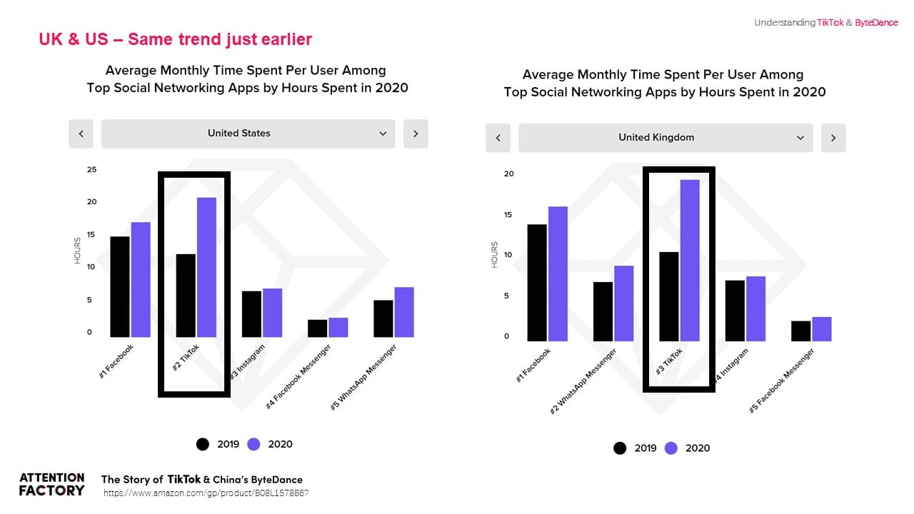 За время пандемии TikTok обошел вообще все соцсети в США и Великобритании по среднему времени, проведенному в приложении (см. ниже).