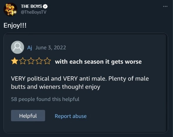 The Boys высмеивает и правую и левую сторону политической арены США (не завидую модераторам), но тем не менее, основной баттхерт возник именно у явно правого крыла фанатов. Это очень смешно, если представить, что они два с половиной сезона не врубались, что именно их кумир — это главный злодей всего сериала.