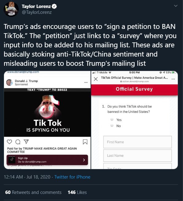 Команда Трампа запустила в Фейсбуке рекламу с призывом подписать петицию о запрете Тиктока в США, потому что приложение "шпионит за буфером обмена пользователей".