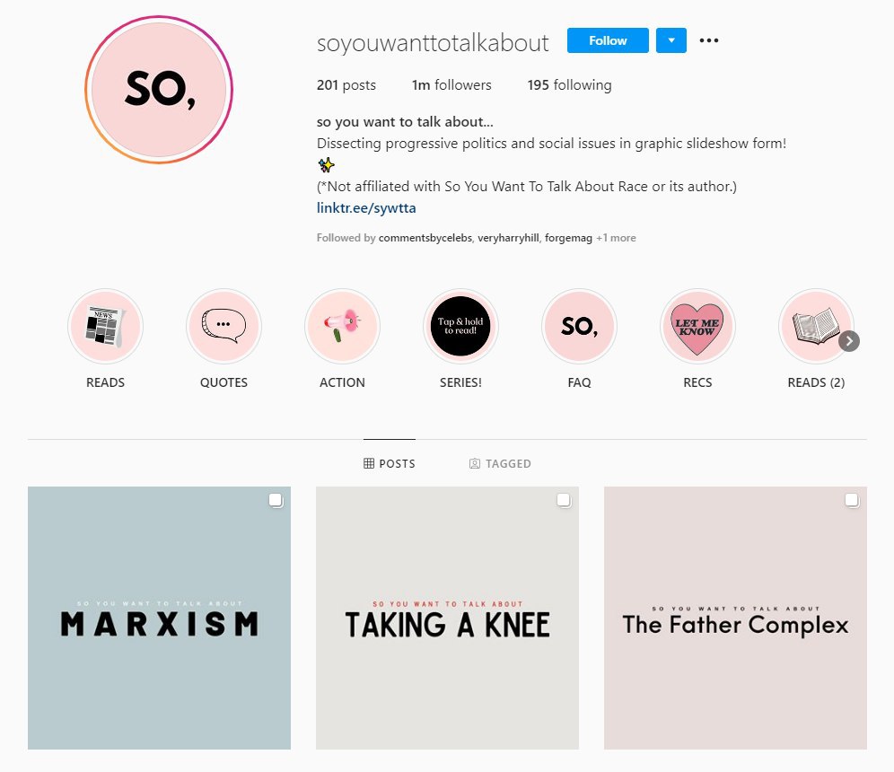 Но как заметил Axios, ситуация изменилась после начала пандемии и протестов в США. Развлекательного контента стало меньше, а на его место пришел информационный (текст, инфографика, тематические иллюстрации). Особой популярностью еще с прошлого года пользуются посты с каруселью, описывающие определенную тему. Например, аккаунт @soyouwanttotalkabout вырос с 125 тыс. в середине июня до 1 млн подписчиков сейчас.