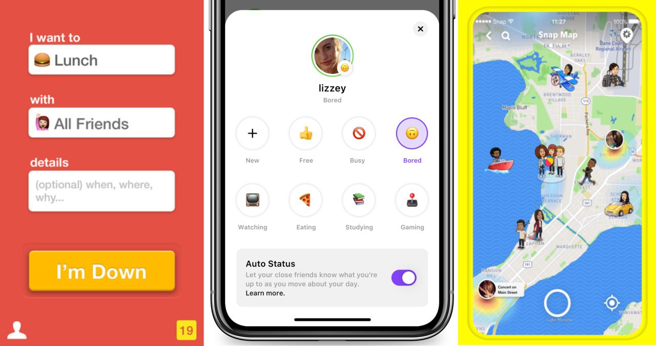 Некоторые соцсети и приложения вроде Foursquare, Zenly, Snap Map показывают, что поблизости находятся наши друзья, но мы по-прежнему не знаем чем они заняты, хотят ли поболтать или встретиться и хотят ли именно с нами.