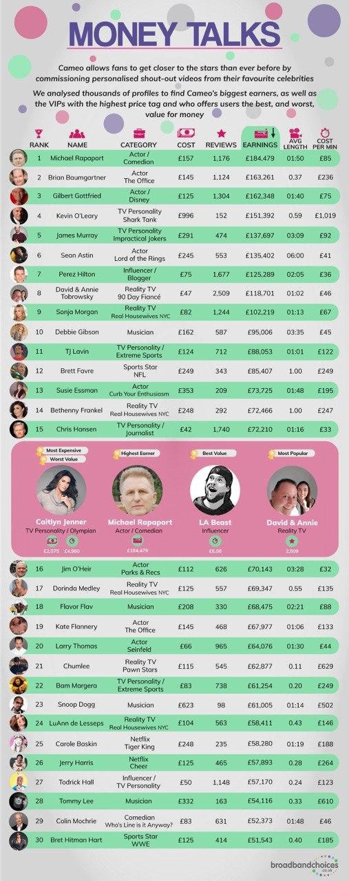 Broadbandchoice проанализировали создателей контента на Cameo: умножили цену за одно видео на количество отзывов каждого инфлюенсера. Получили таким образом их гипотетический доход, и свели это все в таблицу google docs.