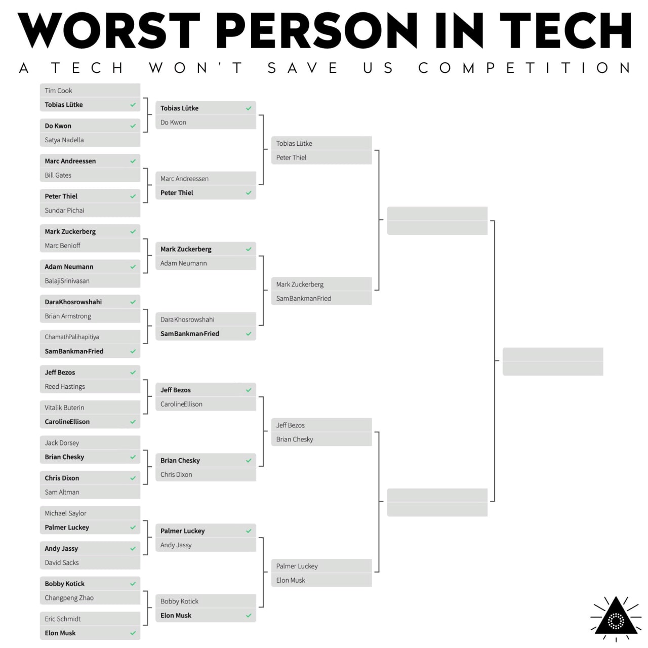 К чему я это все. Прямо сейчас автор прекрасного подкаста Tech Won't Save Us проводит большое голосование за звание худшего человека в tech-индустрии. В четвертьфинал уже вышли наши любимые Питерь Тиль, Цукерберг, Безос, и конечно новоиспеченный кумир правых конспирологов. Голосуйте, пока он и это не запретил.