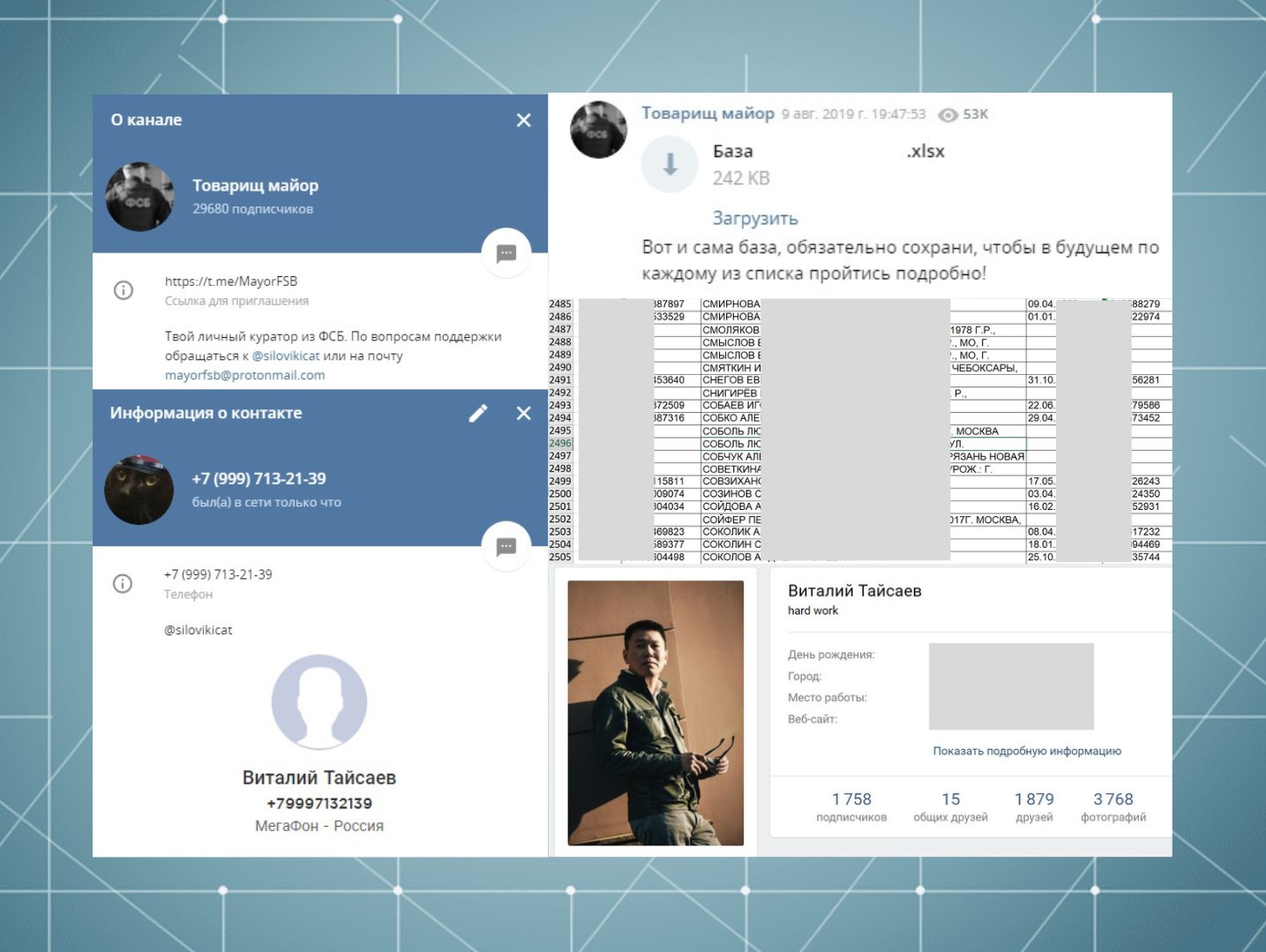 В пятницу 9 августа, за день до митинга на проспекте Сахарова, в телеграм-канале «Товарищ майор» появился пост с приложенным файлом Excel под названием «База». В файле 3198 полей с личными данными: телефон, ФИО, адрес регистрации, дата рождения, номер паспорта. В описании телеграм-канала его авторы называют себя «твоим личным куратором из ФСБ». По вопросам сотрудничества предлагают обращаться к пользователю @silovikicat («Кот силовиков»).