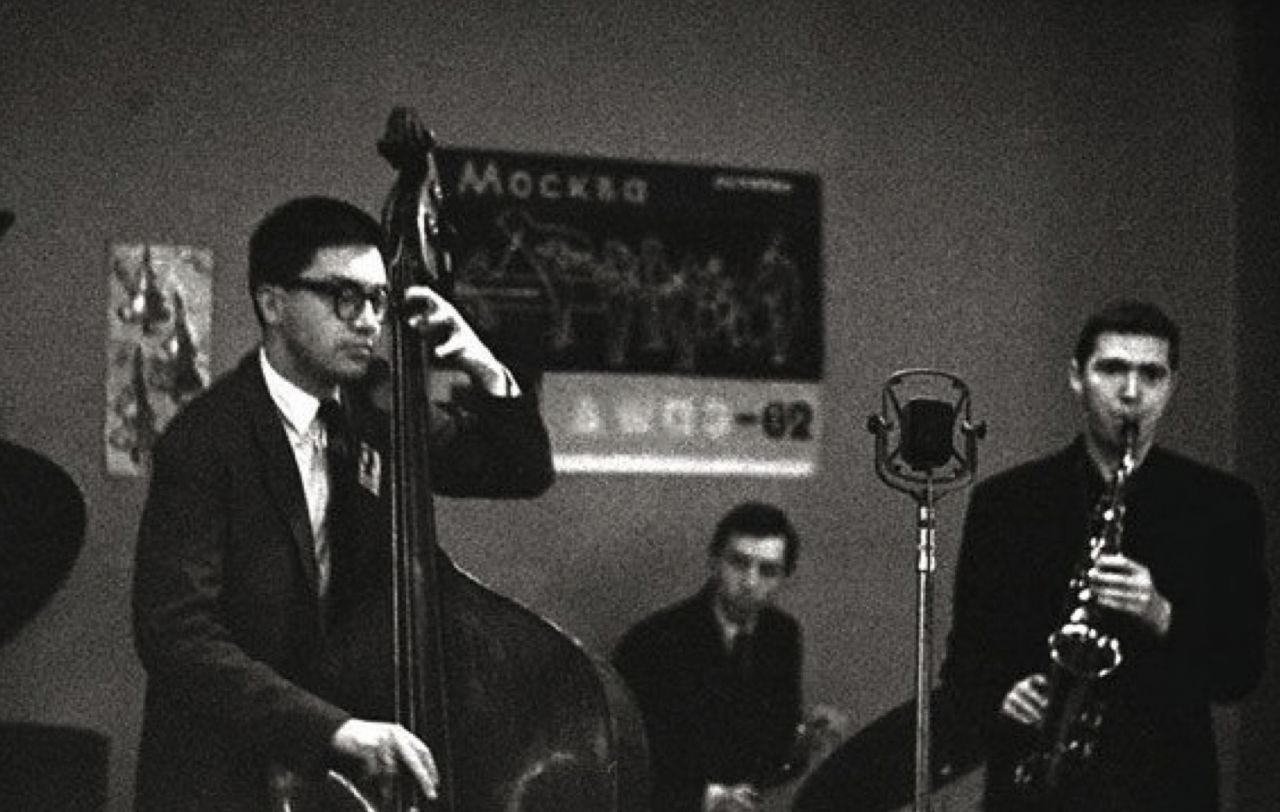 Фото внизу сделано 5 октября 1962 года. Молодые джазисты Игорь Берукштис (контрабас) и Борис Мидный (саксофон) выступают на фестивале "Джаз-62" в московском кафе "Молодежное". "Молодежное" набито битком: в джазовой Москве, разгоряченной летним выступлением Бенни Гудмана, царит воодушевление и жажда перемен. Как и другие подающие надежды музыканты, Берукштис и Мидный хотят играть джаз во что бы то ни стало, и через два года решатся на дерзкий побег.