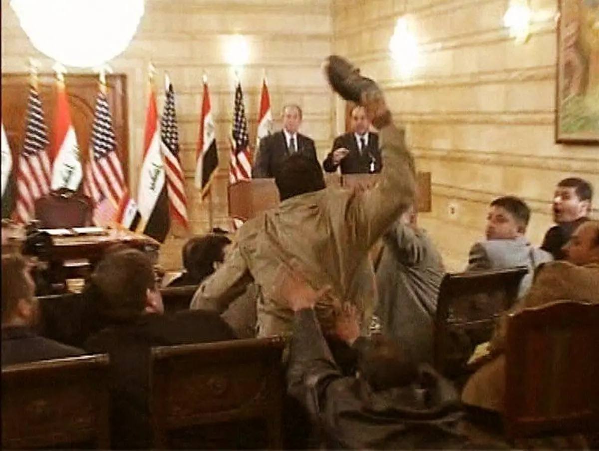 На фотографии иракский журналист Мунтадар Заиди с криком «Это тебе прощальный поцелуй от иракского народа, собака!» бросает в Джорджа Буша ботинок на пресс конференции в декабре 2008 года. За месяц до того, как Буш должен был покинуть Белый дом. Таким образом Мунтадар выразил отношение иракцев к «освободителям». Легендарное видео: https://youtube.com/watch?v=_4rYWc4o-eY