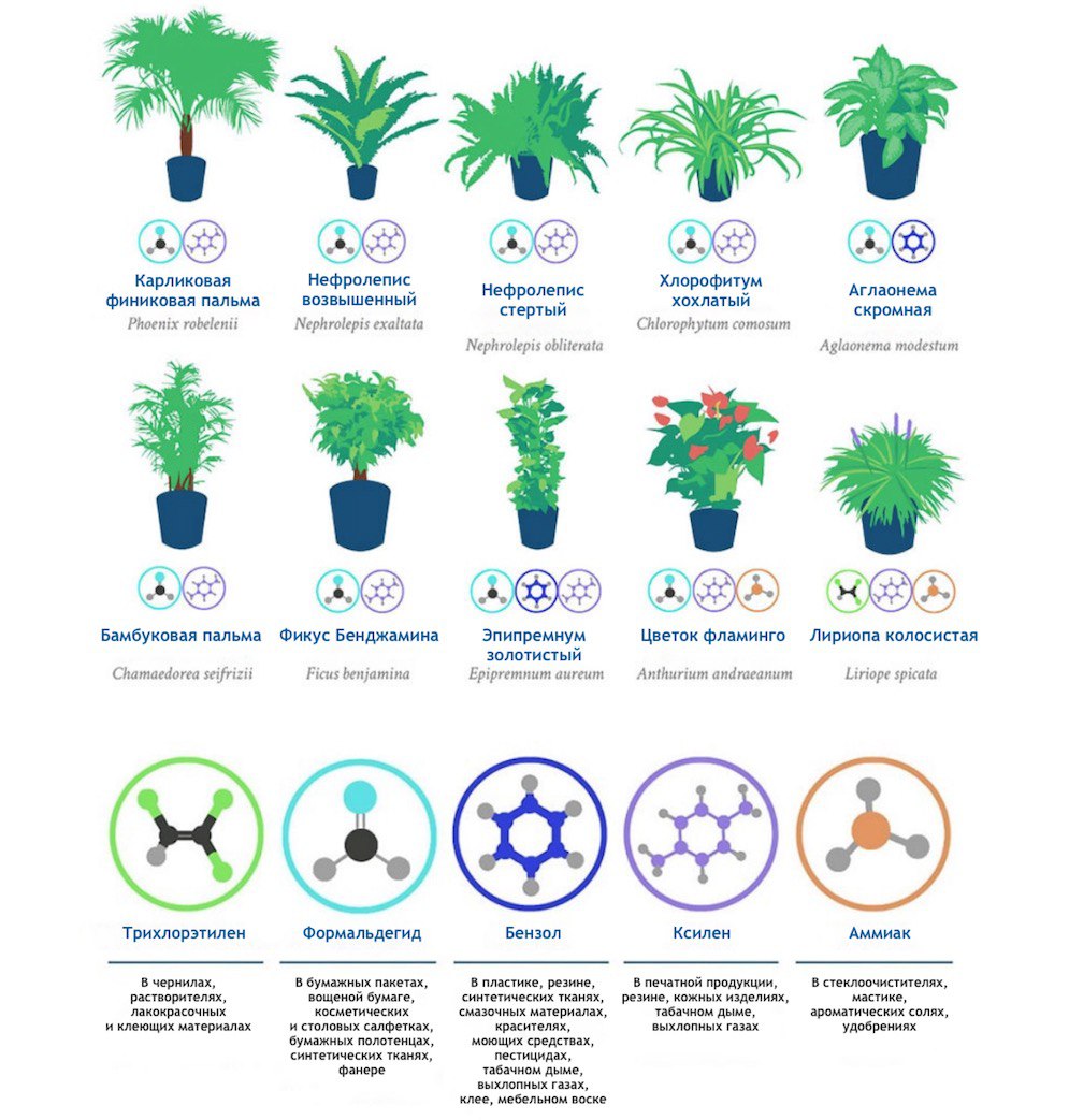 Благодаря многолетнему исследованию на МКС установлено, какие домашние растения эффективнее всего очищают воздух. Подробнее об этом можно прочитать здесь. А мы перевели для вас схему.