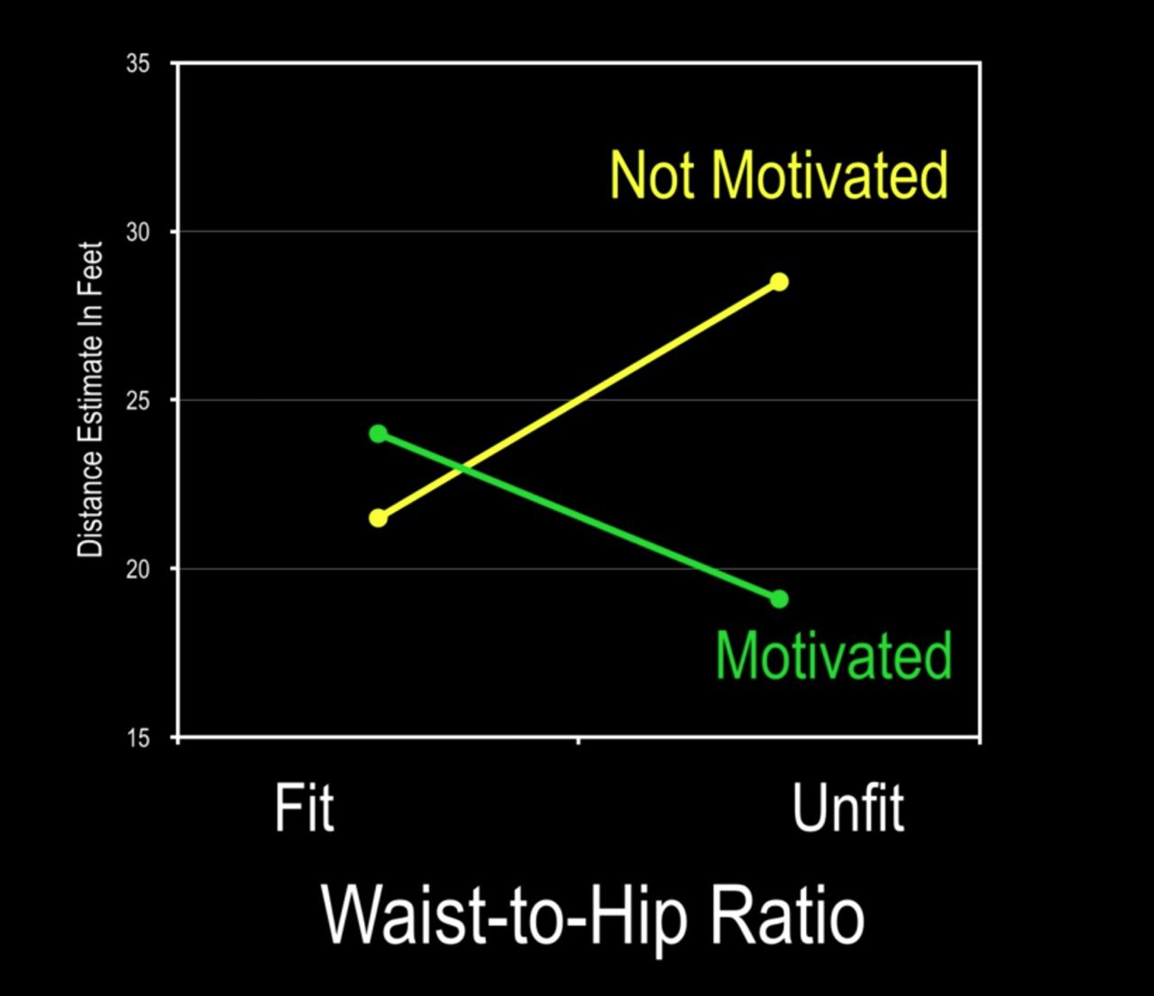 2. Однако на восприятие расстояния влияет и мотивация. Если четко видеть цель и желать ее достичь, то даже человек в плохой физической форме воспринимает дистанцию так же, как и более спортивный и даже лучше. (Зеленая линия на графике.)