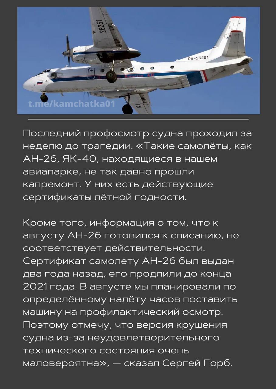 «Разбившийся самолёт Ан-26, который разбился в Палане 6 июля, не готовился к списанию, а вовремя проходил все техосмотры», —сказал заместитель директора по организации лётной работы Камчатского авиационного предприятия Сергей Горб.