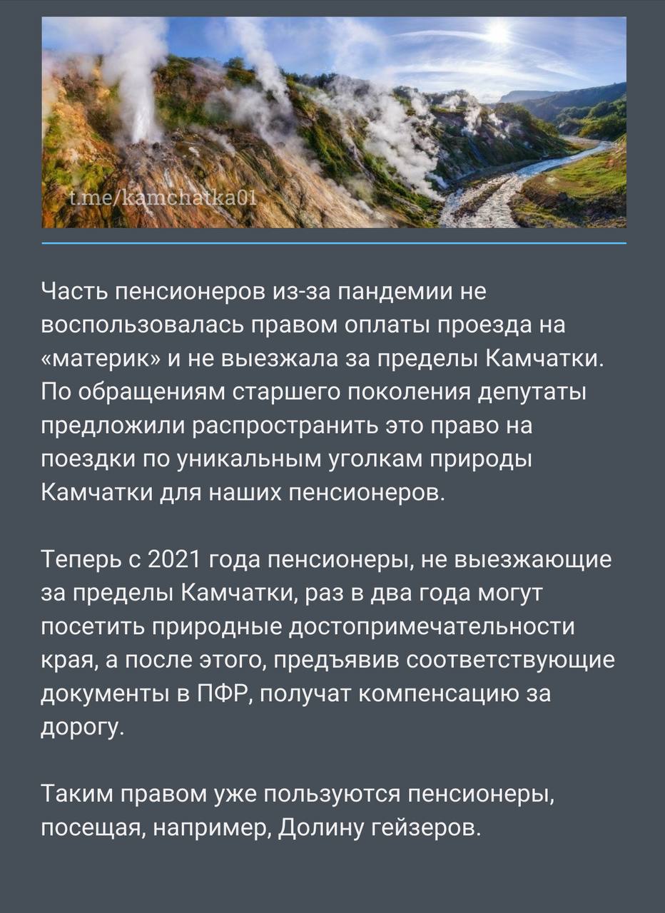 Камчатские пенсионеры могут бесплатно слетать в Долину гейзеров раз в два года.