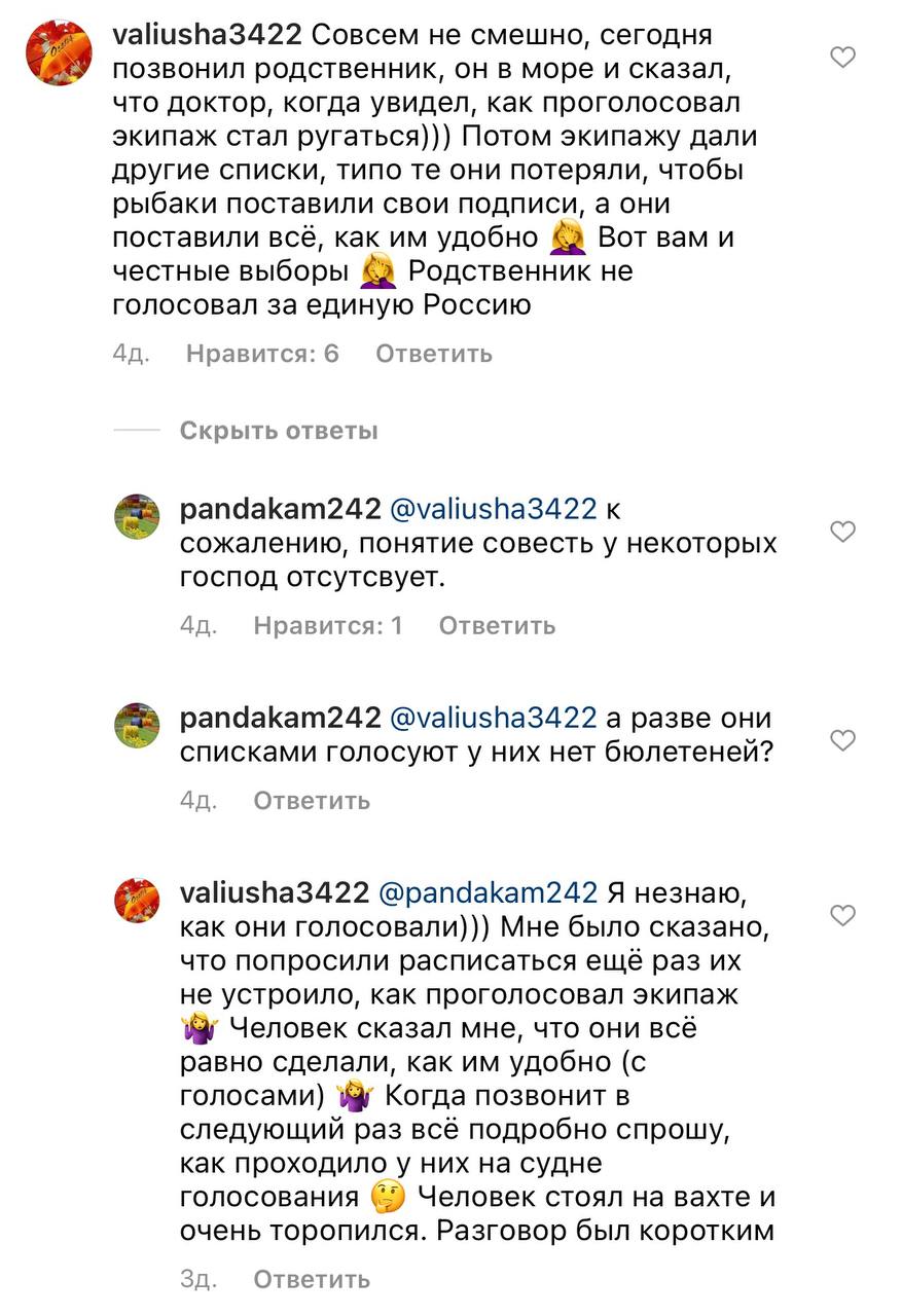 В соцсетях люди жалуются, что находящихся в море рыбаков заставляют переголосовывать повторно, поскольку в первых раз начальство оказалось недовольно получившимся результатом. При чем, второй раз от рыбаков требуют только расписаться за бланк, всё остальное заполнят без них.