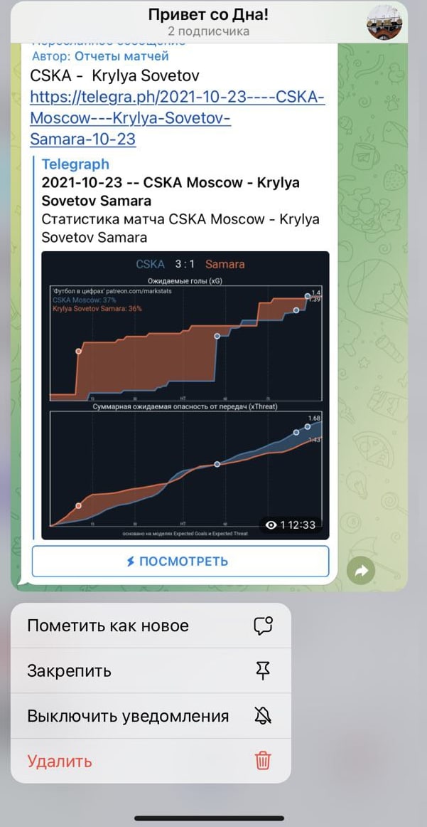 Я репостнул к себе продвинутую статистику матча, но через 10 секунд решил, что надо бы добавить к ней авторской интерпретации (лучшее ведь не враг хорошего?) – и полез удалять сообщение. Мгновенно выделил сообщение и удалил – это я так подумал. Оказалось, удалил весь канал безвозвратно.