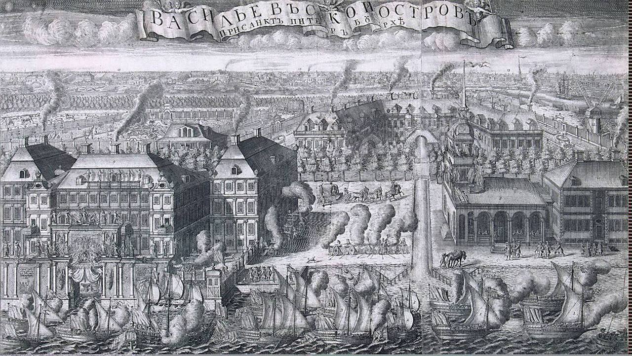 На известной гравюре Алексея Зубова изображен триумфальный ввод шведских судов в Петербург после победы при Гангуте в 1714 году. Правда, на момент создания гравюры Меншиковский дворец, изображенный на переднем плане, еще вовсю строился, работу завершат лишь в 1720 году. Там, где на гравюре Зубова восточнее дворца проходит широкая улица, сейчас начинается комплекс зданий СПбГУ. Среди них флигель и Манеж Кадетского корпуса.