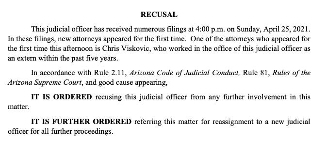 Судья Верховного суда округа Марикопа Кристофер Кури, курировавший дело, связанное с оспариванием демократами аудита, в настоящее время проводящегося в округе, отказался от участия в этом деле. Причина в том, что демократы нашли адвоката, который интернировал судью Кури и нанимал его. Когда сегодня впервые представили нового поверенного, судью вынудили отказаться от дела.