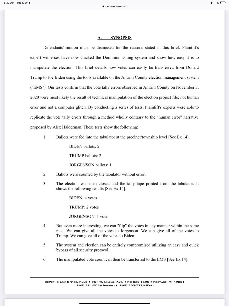 Сегодня ДеПерно представил еще одну команду экспертов, которая утверждает, что взломала код Dominion. В материалах суда ДеПерно заявляет, что его эксперт Джефф Ленберг провел тесты, которые «воспроизводят ошибки подсчета голосов», наблюдавшиеся в округе Антрим. ДеПерно говорит, что эти ошибки противоречат повествованию о «человеческой ошибке».