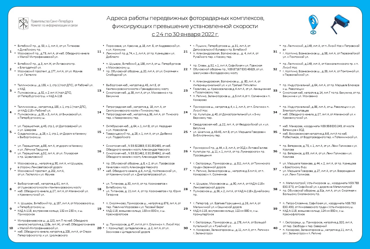 📸Передвижные комплексы фиксируют превышение скорости на аварийно-опасных участках во всех районах города, места дислокации комплексов определяются Управлением ГИБДД ГУ МВД России по г. Санкт-Петербургу и Ленинградской области. Адреса работы всех городских комплексов фиксации нарушений ПДД в открытом доступе публикуются также на сайте Городского мониторингового центра http://spb112.ru/catalogue/5/adress/.