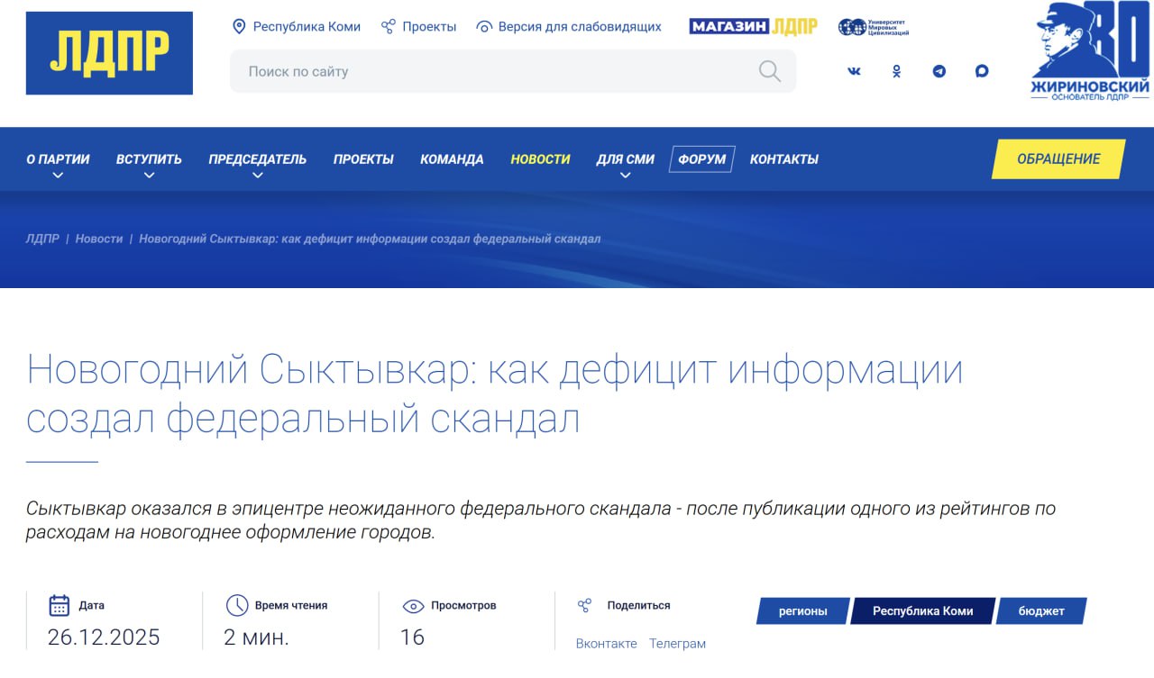 История с «третьим местом Сыктывкара после Москвы и Петербурга» по расходам на новогоднее оформление неожиданно получила продолжение. Теперь в неё активно вписываются либерал-демократы, заявляя, что именно они якобы разобрались в ситуации, «вскрыли правду» и спасли город от федерального скандала. Выглядит эффектно. Но есть ощущение, что одеяло тянут на себя слишком уверенно.