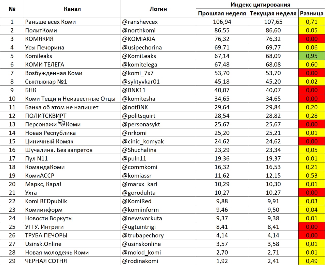 Зачем придумали этот рейтинг? Читатели смотрят на такую статистику и понимают, каналов много, а интересных не очень. Чем выше ИЦ, тем больше доверия к каналу со стороны администраторов других каналов. Komileaks сегодня в зелёной зоне, и приятно, что по цитированию обогнал некогда популярную Коми Телегу. В жёлтой зоне каналы, которые также прибавили, но не так значительно. В красной зоне каналы, которые не сдвинулись с места.