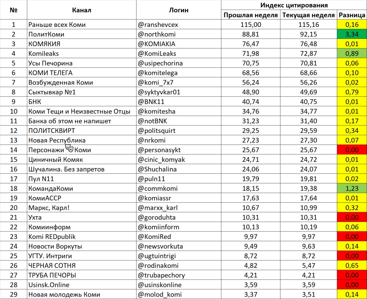 Выходной день на календаре, а это значит, что пора знакомить читателей с рейтингом цитирования каналов местной коми поляны.
