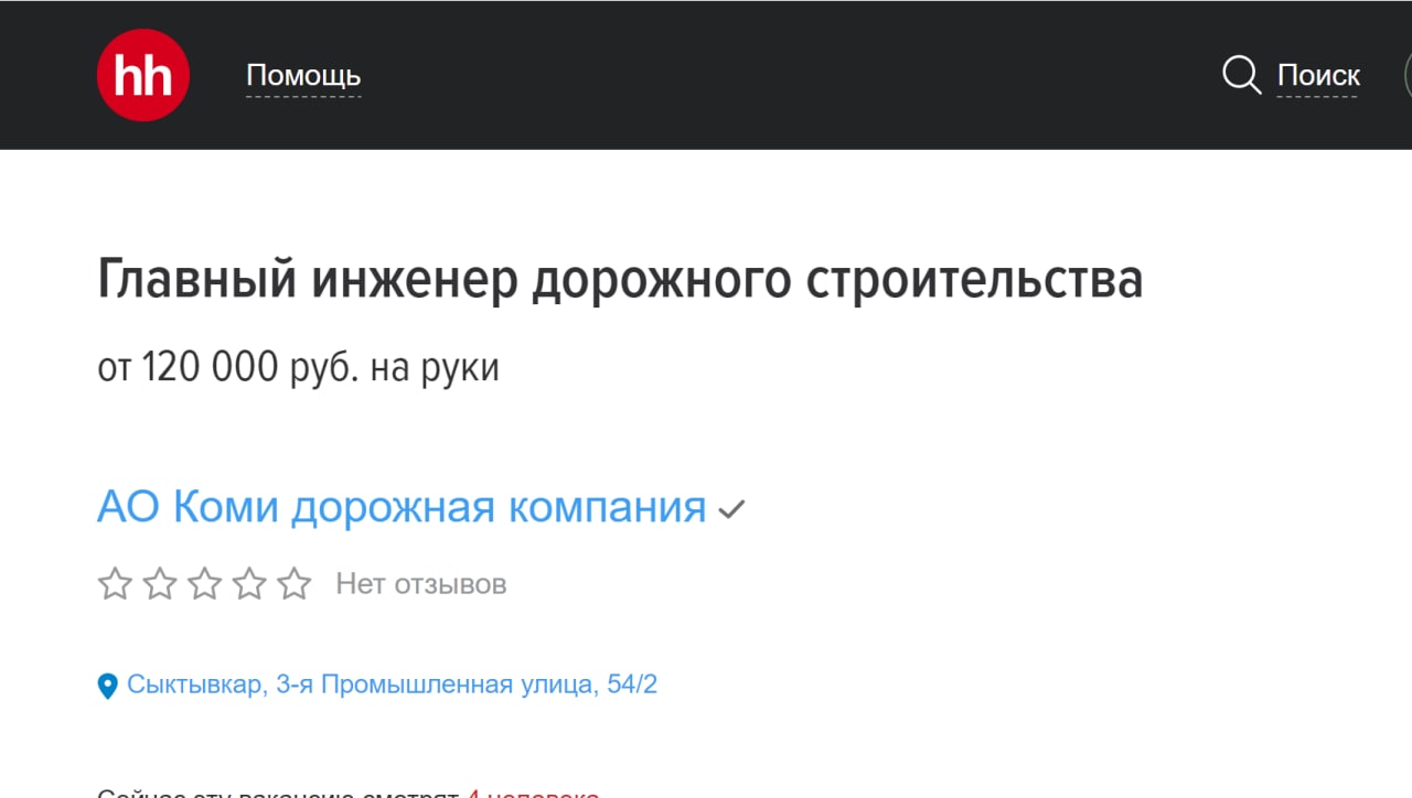 Вот вы говорите, что дорожная отрасль в Коми загибается и крупнейшее предприятие банкротится. Оказывается, нет. АО Коми дорожная компания ищет на работу главного инженера дорожного строительства с зарплатой от 120 000 руб. на руки.