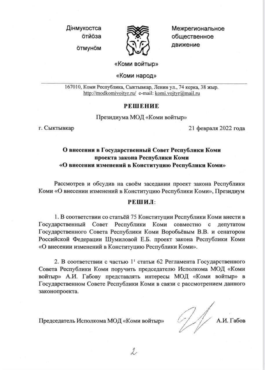 На различных телеграмм каналах,на данный момент,публикуется информация о том, что МОД «Коми войтыр» поддержал законодательную инициативу депутата Госсовета РК (возможно «иностранного агента») Воробьева В.В.