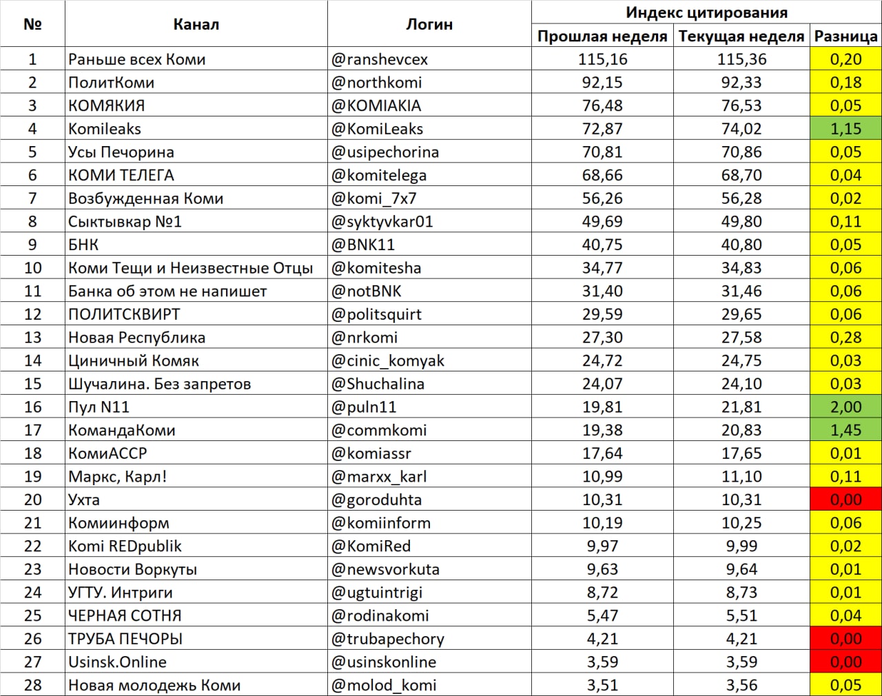 Выходной день на календаре, а это значит, что пора знакомить читателей с рейтингом цитирования каналов местной коми поляны.