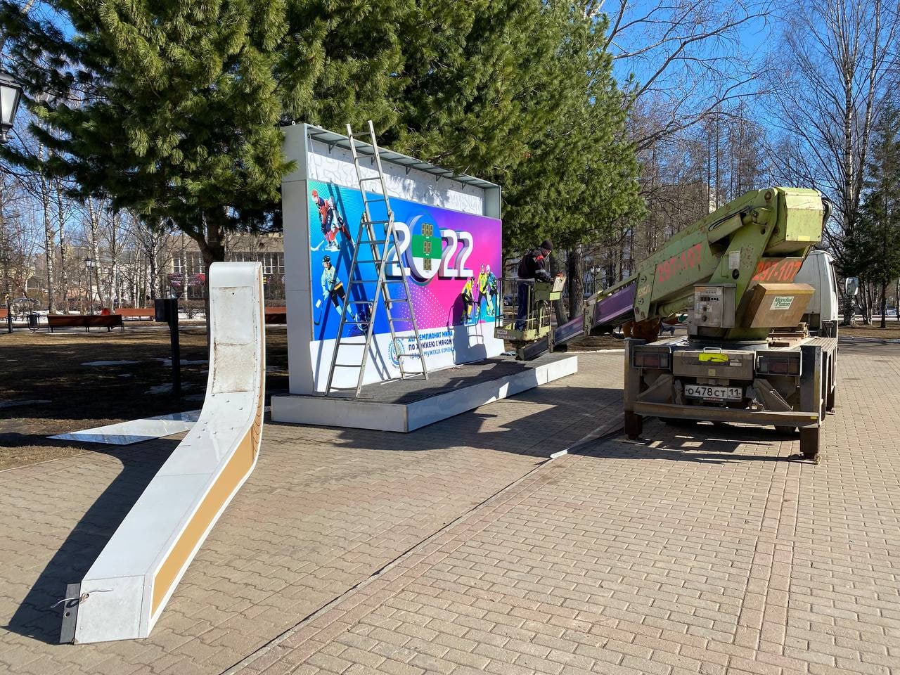 На Стефановской площади в Сыктывкаре демонтируют стенд с отсчётом времени до начала Чемпионата мира по хоккею с мячом, который откладывался сначала из-за пандемии и неготовности республиканского стадиона, а теперь не состоится из-за внешнеполитической изоляции России.