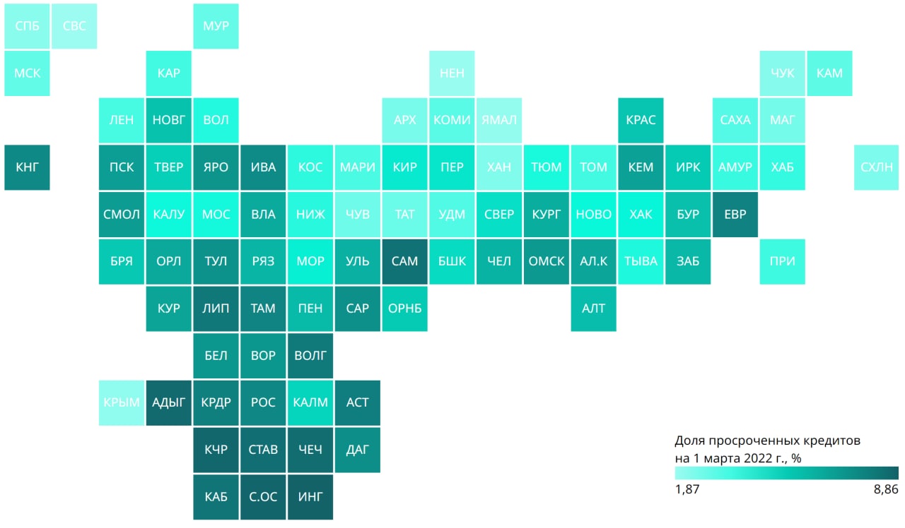 Агентство РИА Рейтинг составило рейтинг российских регионов по доле просроченных кредитов. Платежная дисциплина российских заемщиков в 2021 году выросла в 80 из 85 регионов. Исследование подготовлено экспертами агентства РИА Рейтинг по данным Центробанка и Росстата. Доля просроченных кредитов определена как отношение объема просроченной задолженности к объему ссудной задолженности населения перед банками. Она рассчитана в рублях на 1 марта 2022 года.