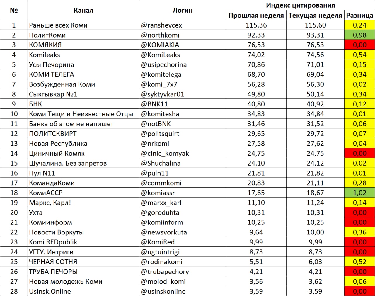 Выходной день на календаре, а это значит, что пора знакомить читателей с рейтингом цитирования каналов местной коми поляны.